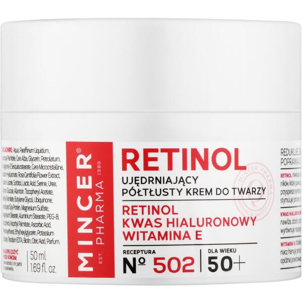 Caution: Apply an SPF 30 or higher, the morning after use, Contains Vitamin A. Consider your daily intake before use, Not recommended for pregnant women and children Discover Pharma Retinol No. 502 Firming Cream by the Polish company Mincer, specially crafted for the daytime care of mature skin over 50. With its powerful active ingredients, this cream deeply nourishes and hydrates, enhancing skin firmness and elasticity, strengthening skin turgor, and revitalizing its overall condition. The formula's star ingredient, retinol, effectively combats free radicals that contribute to aging and stimulates collagen production within the skin.